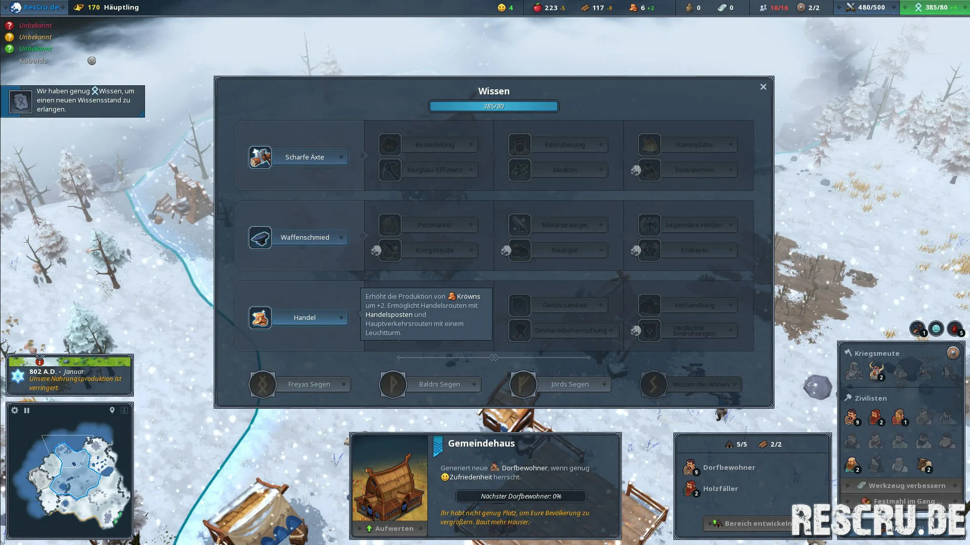 Komplexe Produktionsketten, wie zum Beispiel in den Anno-Reihen, sucht man in Northgard vergebens. Gesammelte Rohstoffe wandern umgehend in das Lager und können ohne Wenn und Aber 1 zu 1 weiterverarbeitet werden. Das mag für den einen oder anderen Spieler ein Manko sein – das Spiel hat nun mal einen anderen Kern – das Überleben. Die Natur ist dabei unser größter Feind, denn neben Angriffen andere Clans müssen wir uns auch gegen Schneestürme, Erdbeben und Rattenplagen behaupten. Auch Kröwns (Spielwährung) müssen verdient werden um zu Handeln und um unsere Armee weiter auszubauen.
